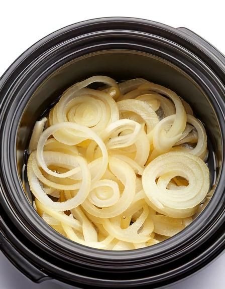Put raw sliced onions in a slow cooker with these 2 ingredients. Dinner doesn’t get easier
