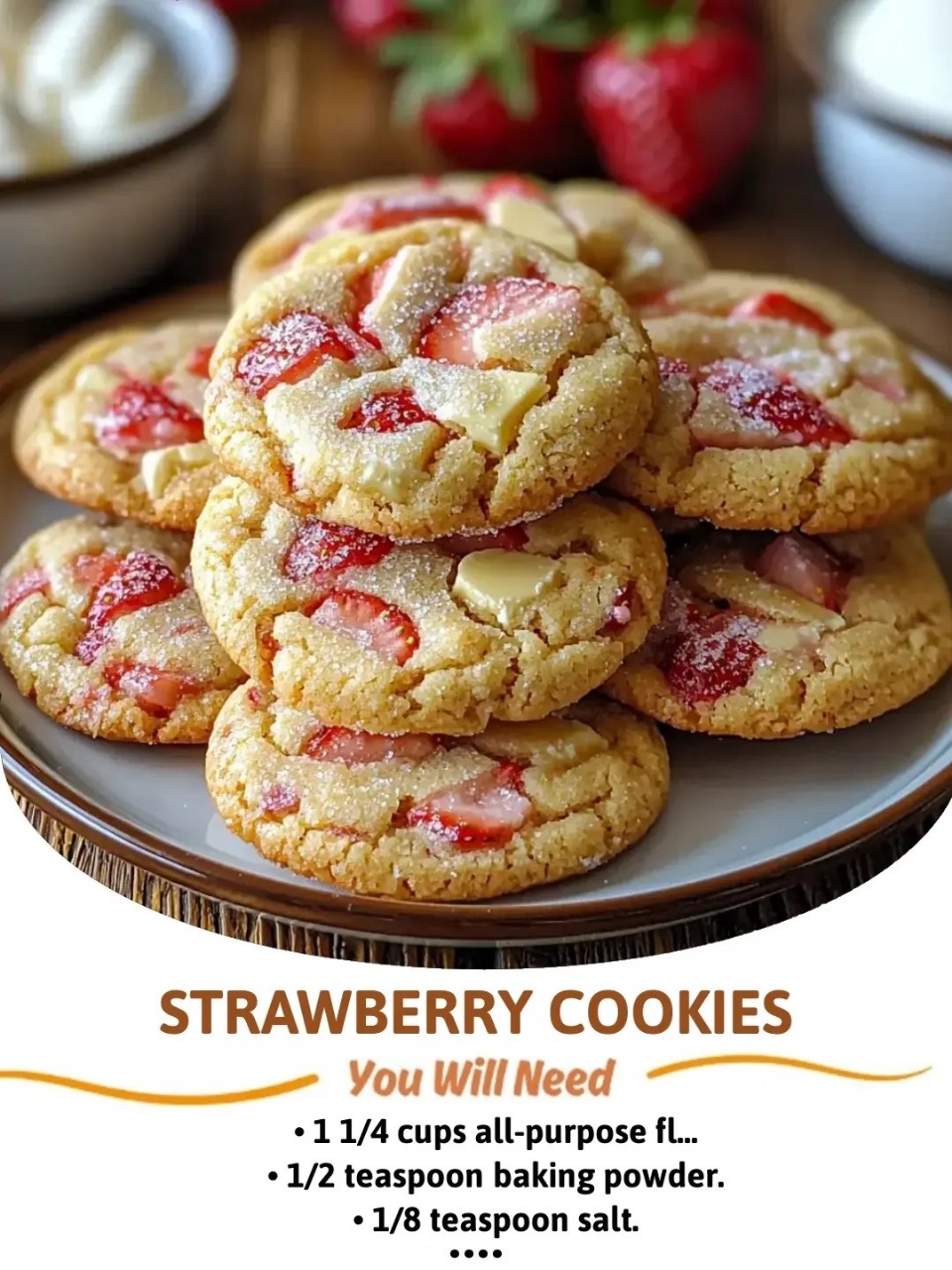 Tender cookies featuring fresh strawberries, cream cheese, and white chocolate chunks. A perfect balance of sweet and tangy flavors.